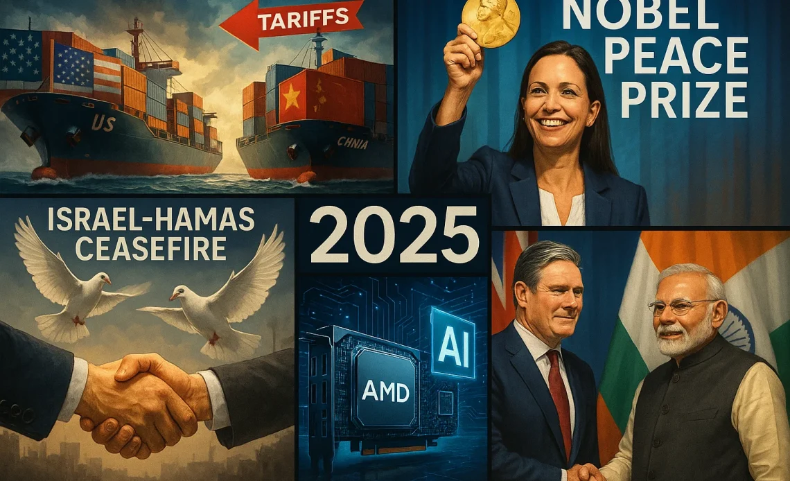 President Trump slapped a 100% tariff on Chinese imports, Venezuela’s María Corina Machado won the 2025 Nobel Peace Prize, Israel and Hamas agreed to a fragile ceasefire, AMD partnered with OpenAI, and the UK-India relationship got a major boost.